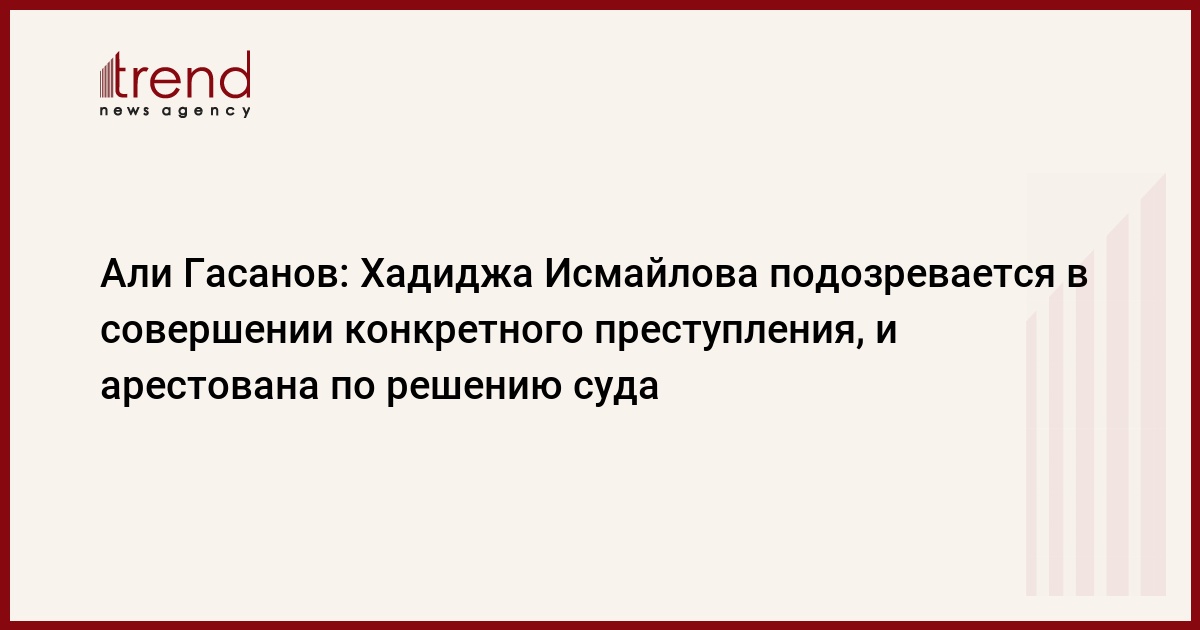 БАКУ /Trend/ - Сотрудник радио "Азадлыг" Хадиджа Исмайлова подозревается в совершении конкретного преступления, и арестована по решению суда. Об этом АзерТАдж сказал в понедельник заведующий отделом по общественно-политическим вопросам Администрации Президента Азербайджана Али Гасанов.
