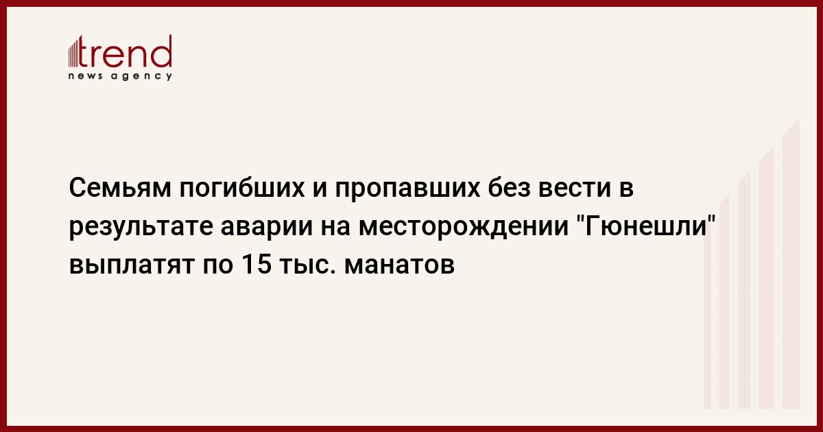 Согласно документу, с целью выполнения распоряжения Президента Азербайджана от пятого декабря, учитывая предложения госкомиссии, созданной в связи с аварией на платформе, семьям погибших и пропавших без вести нефтяников из предусмотренного в госбюджете на 2015 год Резервного фонда будет выплачена единовременная финансовая помощь по 15 тысяч манатов.