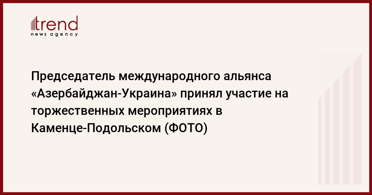 БАКУ/ Trend/ - Председатель международного альянса "Азербайджан-Украина" Эльмар Мамедов и председатель Союза женщин альянса Севиндж Гасанова по приглашению мэра города Каменец-Подольский Михаила Семашкевича приняли участие на торжественных мероприятиях, посвященных Дню Города.