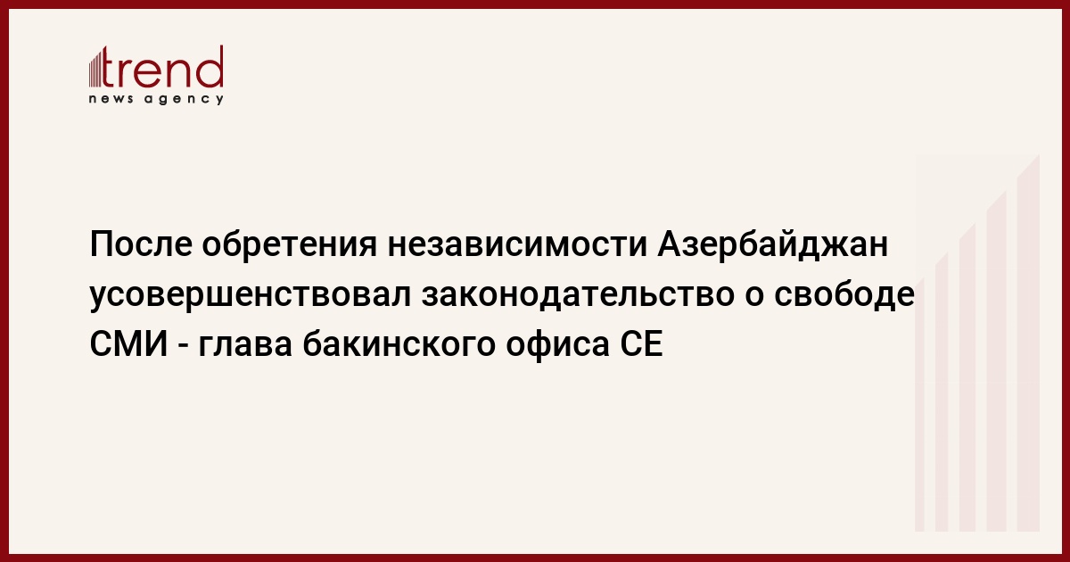 БАКУ /Trend/ - После обретения независимости Азербайджан усовершенствовал законодательство о свободе СМИ, сказала глава бакинского офиса Совета Европы.