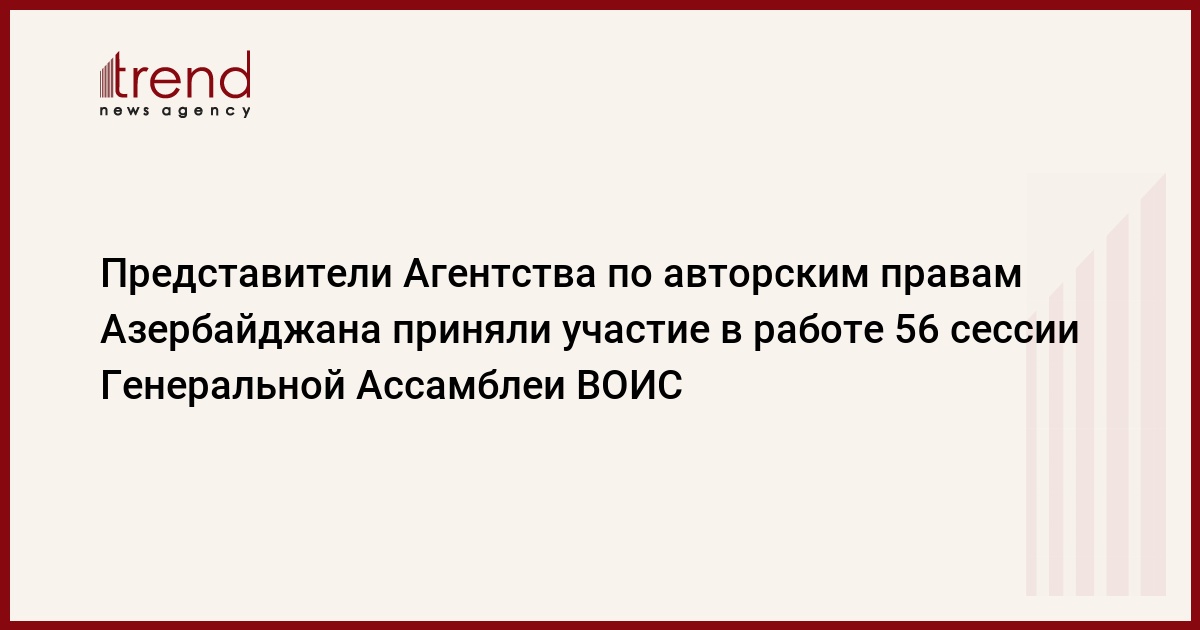БАКУ /Trend/ - С третьего по 11 октября в Женеве проходит 56 сессия Генеральной Ассамблеи стран–членов Всемирной Организации Интеллектуальной Собственности (ВОИС). В период 3-5 октября делегация Агентства по Авторским Правам Азербайджана во главе с председателем Агентства Кямраном Имановым участвовала в работе Ассамблеи, где были представлены к обсуждению важные итоги системы авторского права и промышленной собственности за истекший год, говорится в сообщении Агентства.