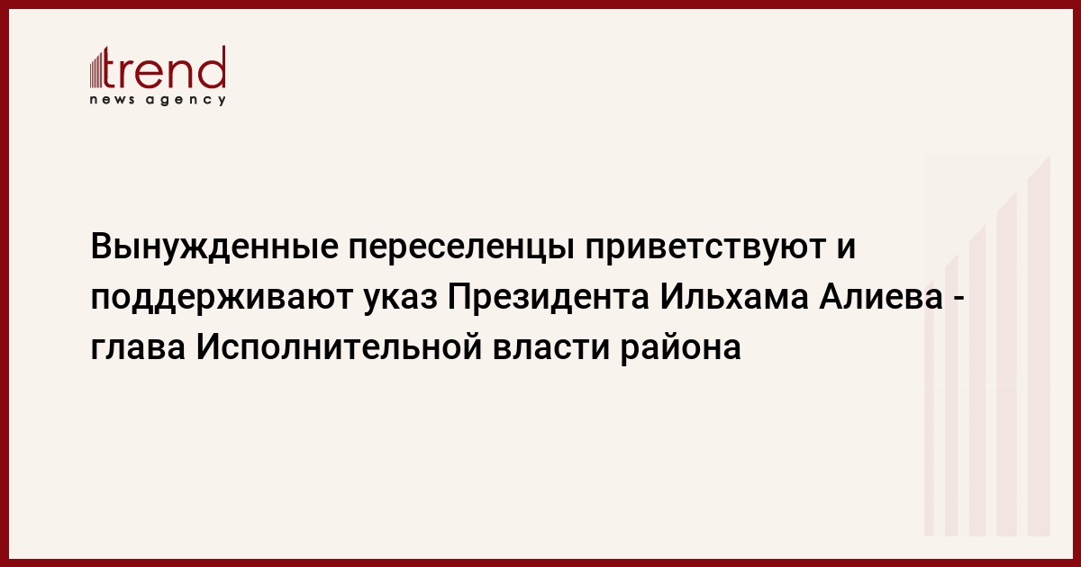 БАКУ /Trend/ - Указ Президента Ильхама Алиева об обеспечении адресности средств, выделяемых из госбюджета для социальной защиты вынужденных переселенцев и приравненных к ним лиц, и упрощении механизма их выплаты очень обрадовал семьи переселенцев, сказал Trend во вторник глава Исполнительной власти Агдамского района Рагуб Мамедов.
