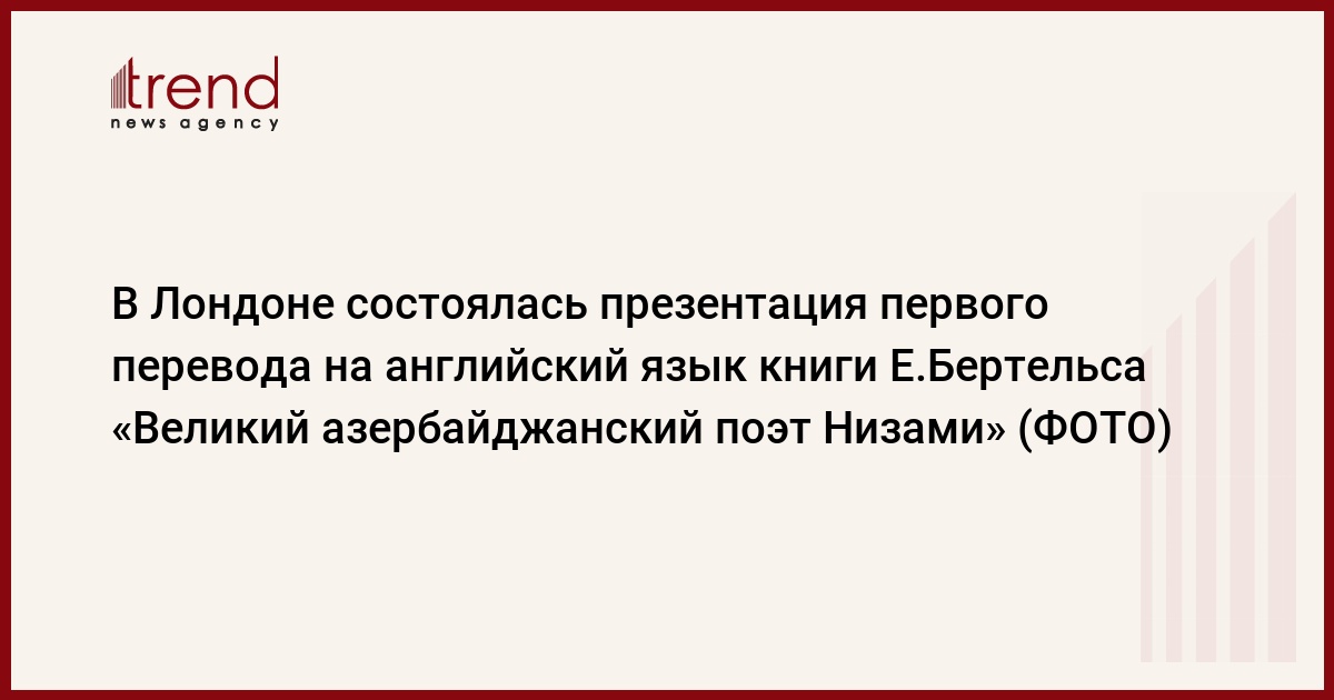 БАКУ /Trend/- Пятого июня в Лондоне, в Доме-музее известного художника периода королевы Виктории Лорда Лейтона (1830-1896) (www.rbkc.gov.uk/subsites/ museums/leightonhousemuseum1.aspx) состоялась презентация первого академического перевода на английский язык книги ученого-востоковеда Евгения Бертельса «Великий азербайджанский поэт Низами» («The Great Azerbaijani Poet, Nizami»), переведенного и подготовленного к печати Научным центром Азербайджана и кавказоведения имени Низами Гянджеви при Оксфордском университете (www.orinst.ox.ac.uk/research/nizami-ganjavi/home).