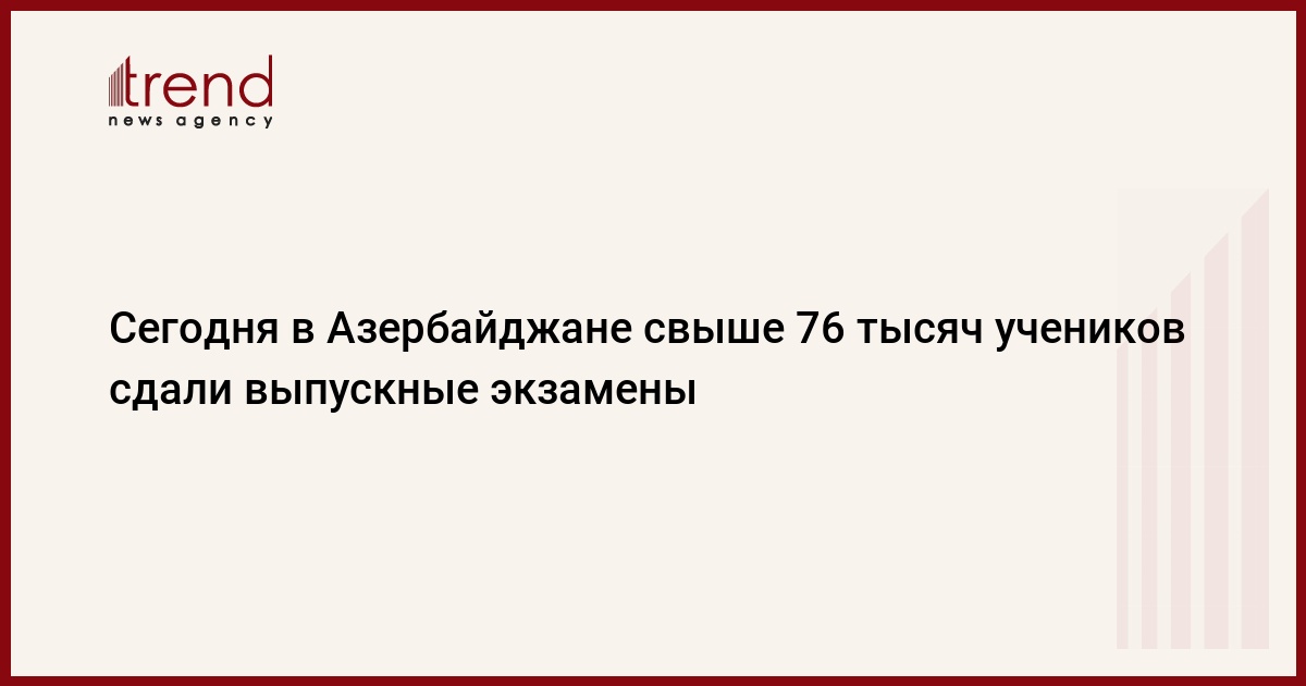 БАКУ /Trend/ - Государственный экзаменационный центр (ГЭЦ) в субботу провел централизованные выпускные экзамены для 76636 учеников (43781 – 9 класс, 32855 – 11 класс) выпускных классов средних общеобразовательных учреждений, расположенных в Баку, Сумгаите, Абшероне и Нахчыванской АР, говорится в сообщении ГЭЦ.