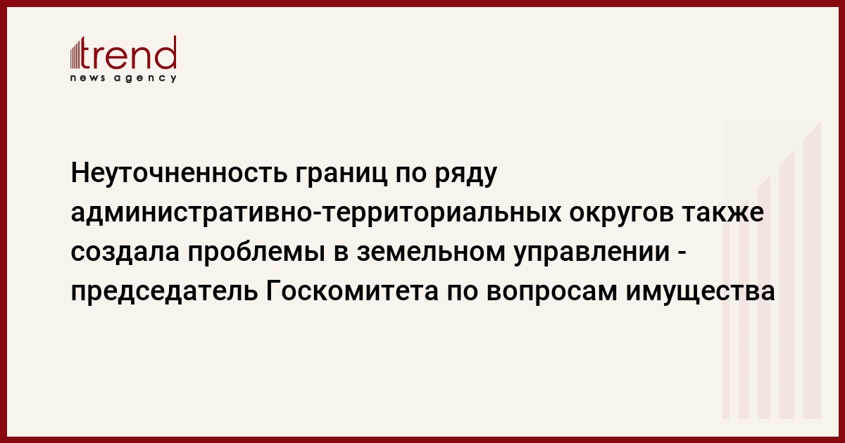 Неуточненность до настоящего времени границ по ряду административно-территориальных округов также создала проблемы в земельном управлении. В настоящее время совместно с соответствующими центральными и местными органами исполнительной власти принимаются меры по решению этих проблем.