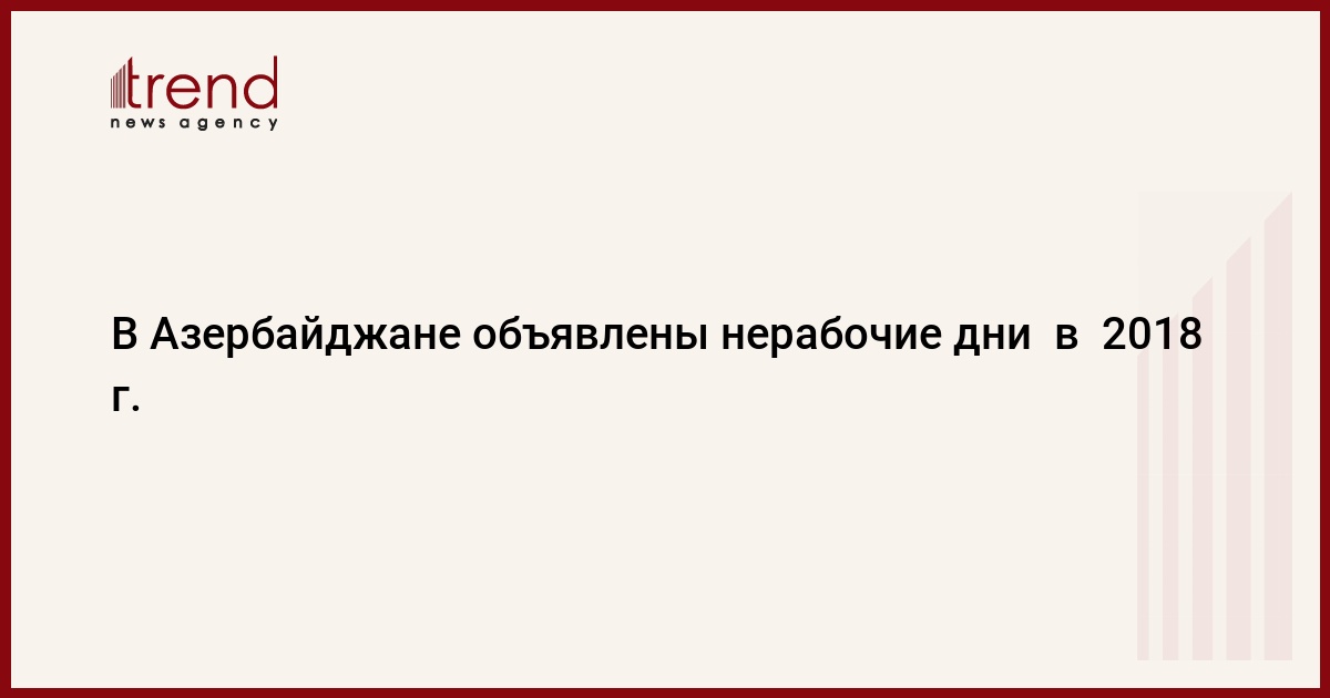 Нерабочими днями в 2018 году объявлены: 1-2 января (Новый год), 20 января (День всенародной скорби), 8 марта (Международный женский день), 20, 21, 22, 23, 24 марта - праздник Новруз, 9 мая (День победы над фашизмом), 28 мая (День Республики), 15 июня (День национального спасения), 15, 16 июня (праздник Рамазан), 26 июня (День ВС Азербайджана), 22-23 августа (праздник Гурбан), 9 ноября (День Государственного флага) и 31 декабря (День солидарности азербайджанцев мира).