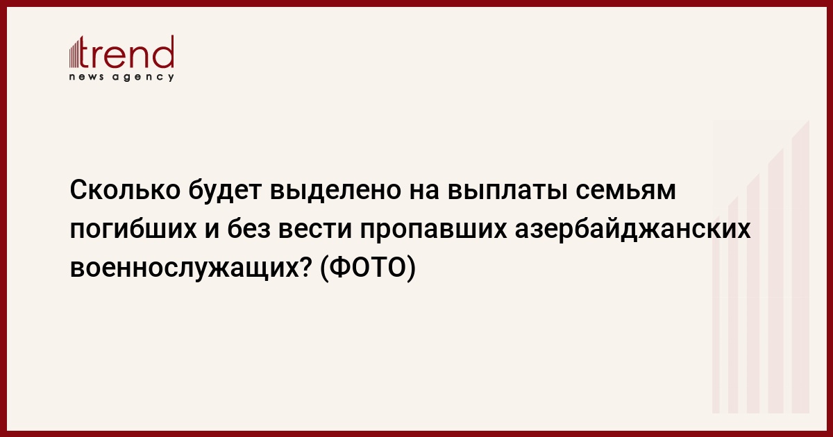БАКУ /Trend/ - По предварительным данным, на выплату пособий наследникам военнослужащих, погибших за территориальную целостность Азербайджана и пропавших без вести во время военных операций до 2 августа 1997 года, потребуется 95-100 миллионов манатов.