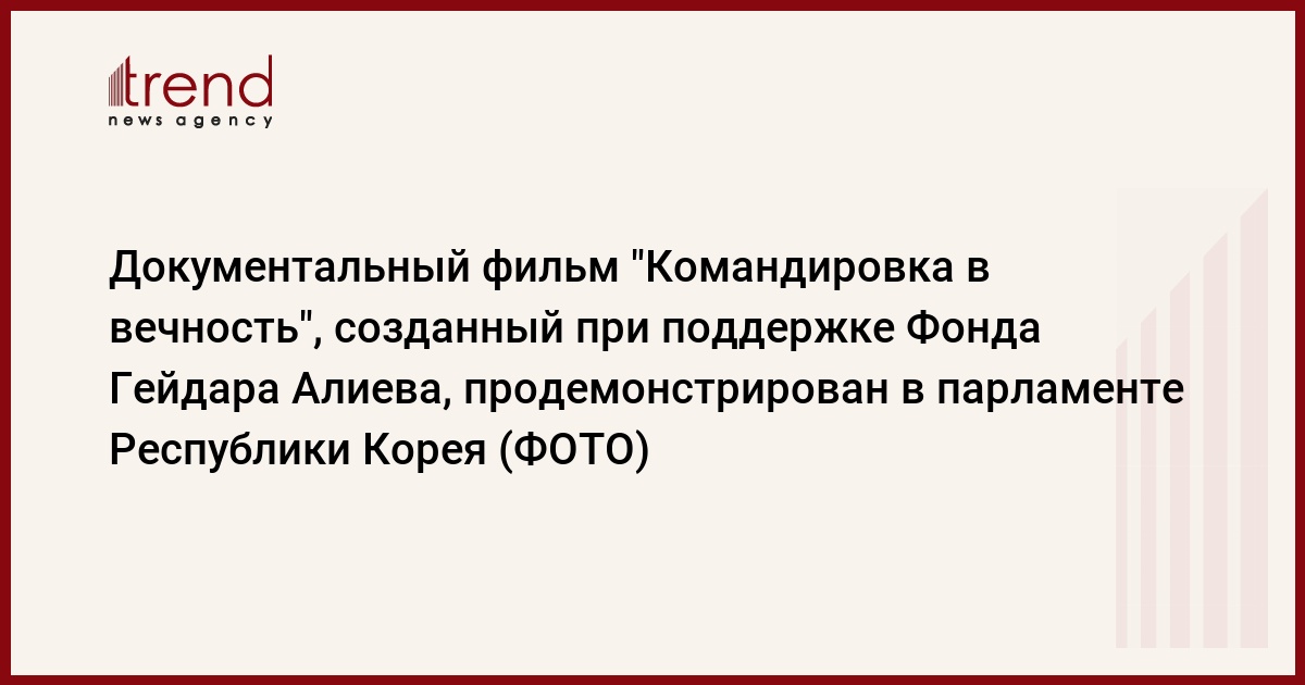 БАКУ /Trend/ - Документальный фильм "Командировка в вечность", созданный Baku Media Center при поддержке Фонда Гейдара Алиева и генеральном продюсерстве Арзу Алиевой, был продемонстрирован в парламенте Республики Корея.