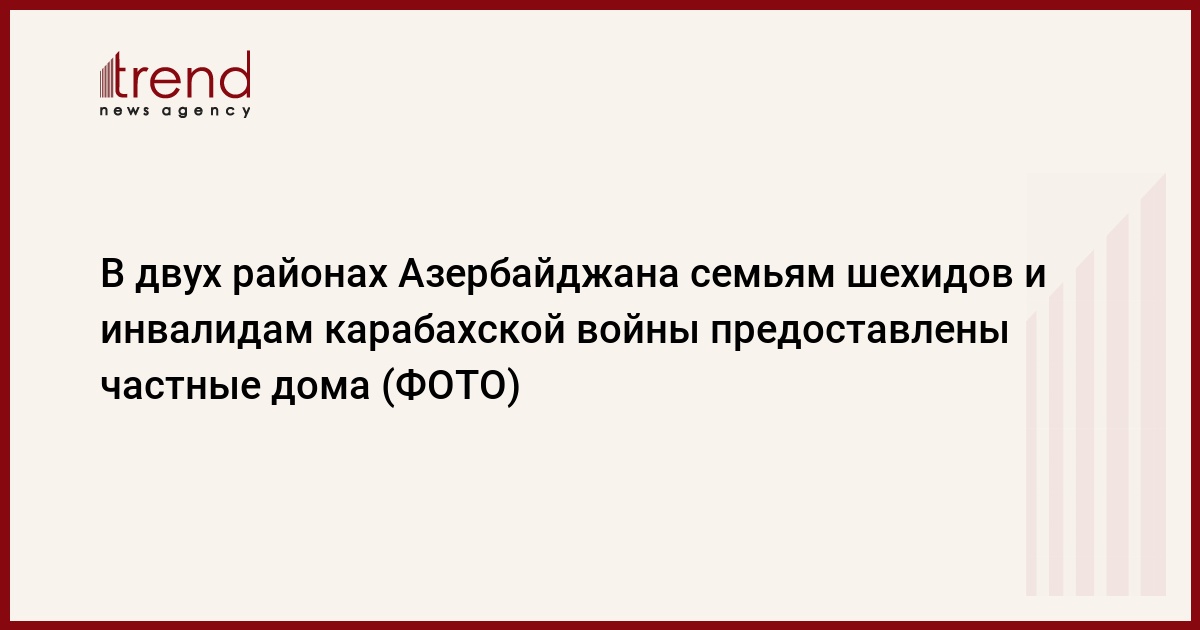 БАКУ /Trend/ - Министерство труда и социальной защиты населения Азербайджана предоставило в пользование семьям шехидов и инвалидам карабахской войны новые частные дома в Кюрдамирском и Агсуинском районах, говорится в субботу в сообщении министерства.