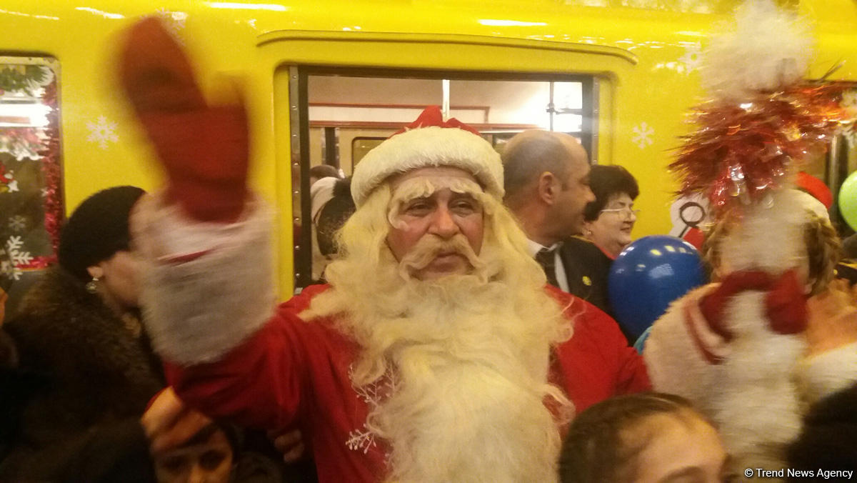 В прибывшем на станцию «Ичеришехер» поезде, к которому был прикреплен ретро-вагон, украшенный новогодней атрибутикой, царила праздничная атмосфера. Главные персонажи новогоднего праздника – Дед Мороз и Снегурочка пришли на встречу с маленькими пассажирами. Дети с большой радостью встретили любимых персонажей. Дед Мороз поздравил детей и их родителей, а также других пассажиров с праздником. Дед Мороз и Снегурочка вручили маленьким пассажирам подарки.