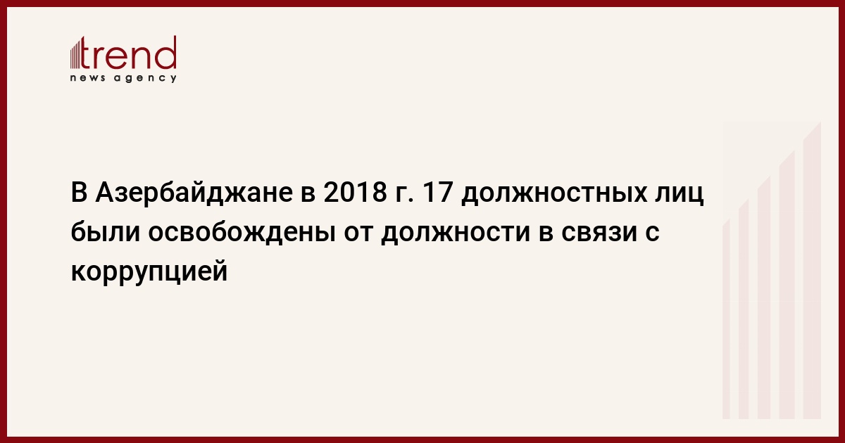 БАКУ /Trend/ - В Азербайджане в прошлом году в связи с коррупцией 25 должностных лиц получили предупреждения, 16 - выговор, три должностных лица - строгий выговор с привлечением к дисциплинарной ответственности, 17 человек были освобождены от должности.