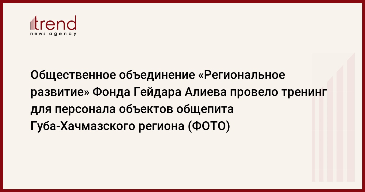 БАКУ /Trend/ - Общественное объединение «Региональное развитие» Фонда Гейдара Алиева организовало тренинг по повышению знаний и опыта административного и другого обслуживающего персонала объектов общепита в Губе, сообщает во вторник Trend со ссылкой на Фонд.