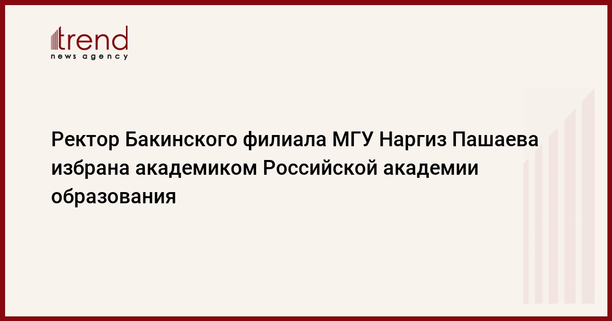 БАКУ /Trend/ - Ректор Бакинского филиала МГУ им. Ломоносова, вице-президент Национальной академии наук Азербайджана (НАНА), академик Наргиз Пашаева 27-го февраля на заседании Общего собрания членов Российской академии образования (РАО) по представлению ректора МГУ им. Ломоносова, академика В.А.Садовничего была единогласно избрана академиком (иностранным членом) РАО. http://rusacademedu.ru/news/v-rossijskoj-akademii-obrazovaniya-proshlo-obshhee-sobranie-chlenov-rao/