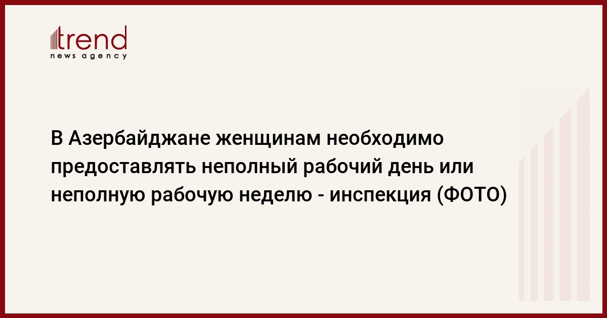 БАКУ /Trend/ - В Азербайджане работодатели должны установить неполный рабочий день или неполную рабочую неделю для беременных женщин, а также женщин, имеющих детей в возрасте до 14 лет, или с ограниченными возможностями здоровья, а также женщин, которые на основании медицинского заключения ухаживают за больным членом семьи. В этом случае продолжительность рабочего дня или еженедельной работы определяется по договоренности сторон.