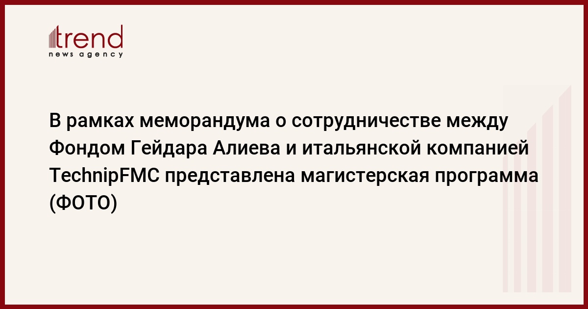 В рамках меморандума о сотрудничестве между Фондом Гейдара Алиева и итальянской нефтяной и газовой компанией TechnipFMC планируется проведение мероприятий для усовершенствования знаний и умений по магистерской программе для студентов, занятых в нефтегазовой сфере, реализация совместных проектов в области науки, технологий и образования.