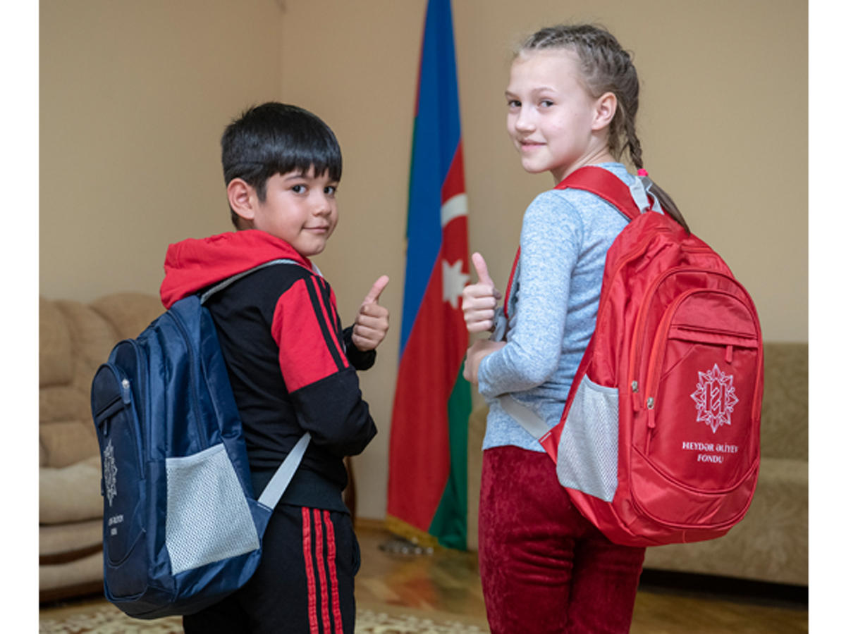 В эти подарочные комплекты, подготовленные по заказу Фонда для детей из Баку и различных регионов страны, входят ранец и различные школьные принадлежности.
