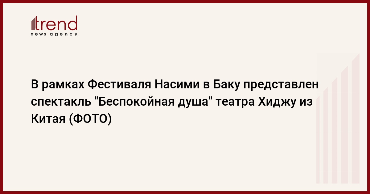 БАКУ /Trend/ - 30 сентября в рамках второго Фестиваля поэзии, искусства и духовности – Насими в Азербайджанском государственном академическом театре оперы и балета был представлен спектакль под названием "Беспокойная душа" (с субтитрами на азербайджанском языке) театра Хиджу провинции Аньхой (Китай), сообщает Trend.