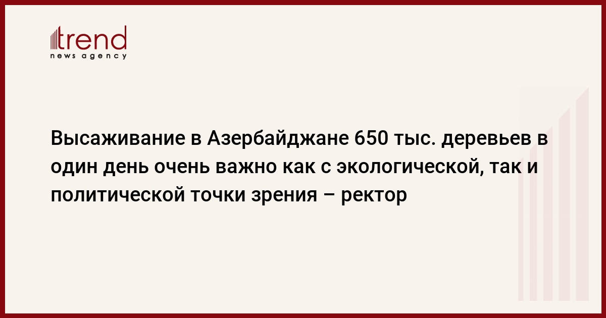 БАКУ /Trend/ - Высаживание в Азербайджане 650 тысяч деревьев в один день по инициативе Первого вице-президента Азербайджана Мехрибан Алиевой в связи с 650-летним юбилеем гениального поэта Насими очень важно как с экологической, так и политической точки зрения, сказал в четверг Trend ректор БГУ Эльчин Бабаев