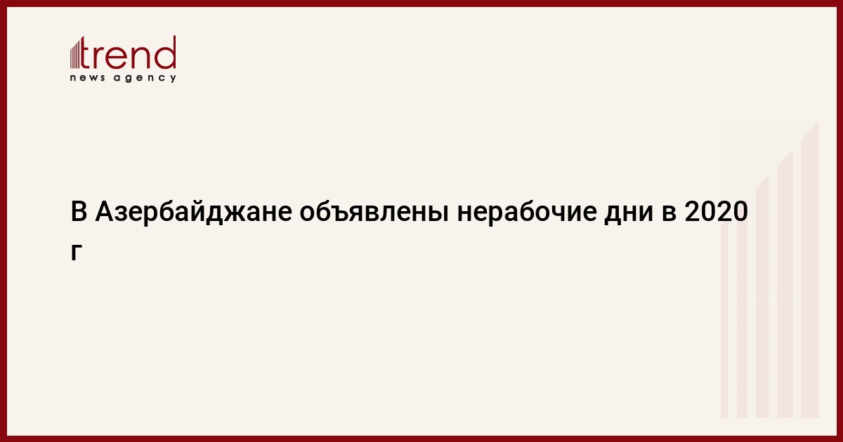 Нерабочими днями в 2020 году объявлены: 1-2 января (Новый год), 20 января (День всенародной скорби), 8 марта (Международный женский день), 20, 21, 22, 23, 24 марта - праздник Новруз, 9 мая (День победы над фашизмом), 24,25 мая (праздник Рамазан), 28 мая (День Республики), 15 июня (День национального спасения), 26 июня (День ВС Азербайджана), 31 июля, 1 августа (праздник Гурбан), 9 ноября (День Государственного флага) и 31 декабря (День солидарности азербайджанцев мира).