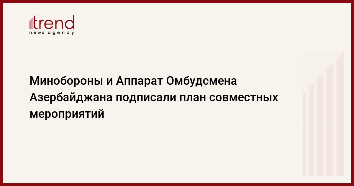 БАКУ /Trend/ - Министерство обороны и Аппарат Уполномоченного по правам человека (омбудсмен) Азербайджана подписали план совместных мероприятий на 2020 год, сообщает во вторник Trend со ссылкой на минобороны.