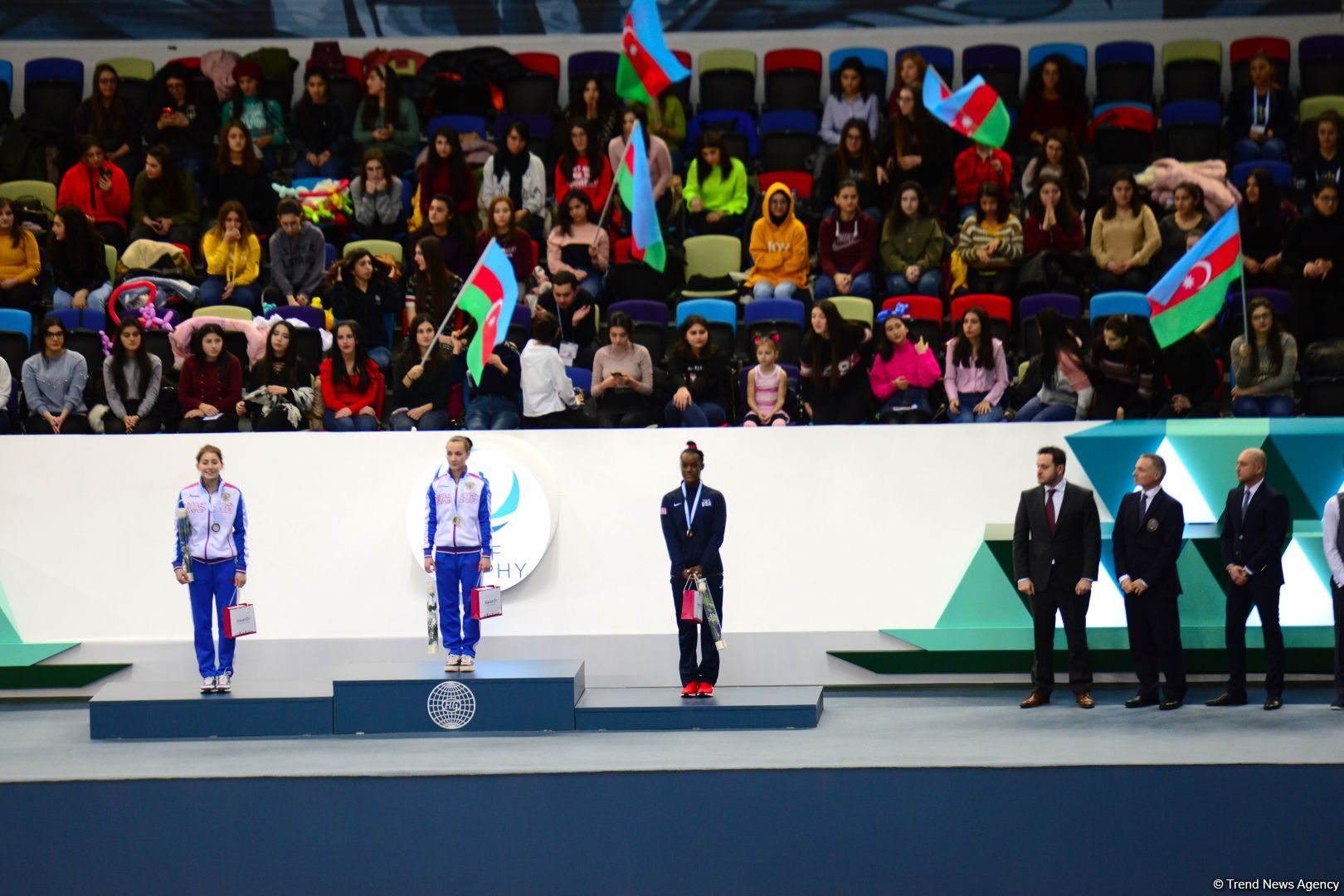 Награды победителям и призерам вручили член технического комитета по прыжкам на батуте Международной федерации гимнастики (FIG) Татьяна Шуйская, олимпийский чемпион, глава отдела спорта Министерства молодежи и спорта Азербайджана Фарид Мансуров и главный тренер сборной Азербайджана по прыжкам на акробатической дорожке Адиль Гусейнзаде.