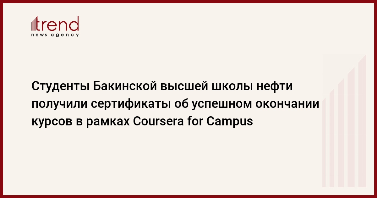 БАКУ /Trend/ - Студенты Бакинской высшей школы нефти (БВШН) успешно окончили курсы, проводимые в рамках глобальной программы дистанционного обучения Coursera for Campus Стэнфордского университета США, и получили сертификаты.