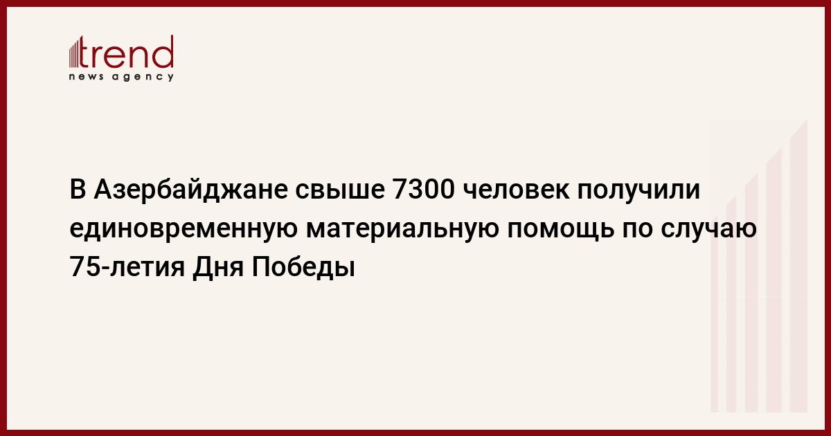 Во исполнение распоряжение Президента Ильхама Алиева от 24 апреля 2020 года, каждому из 256 участников Великой Отечественной войны обеспечено финансирование единовременной материальной помощи в сумме 1500 манатов в связи с 75-летней годовщиной победы в этой войне.