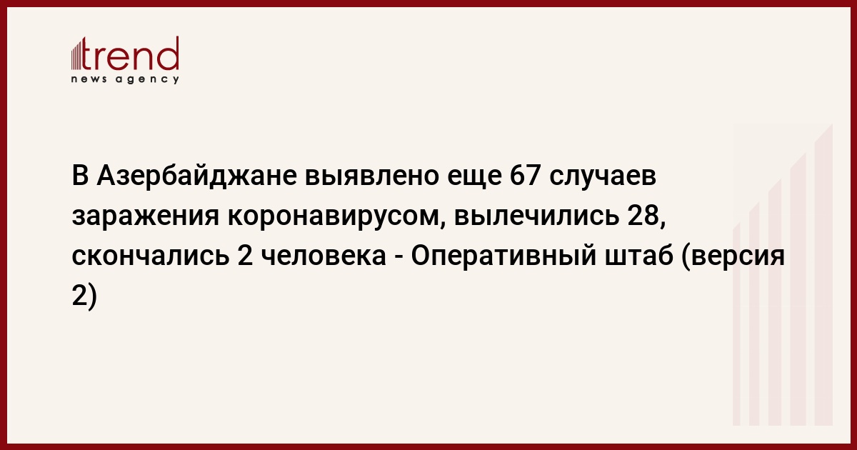 БАКУ/Trend/ - В Азербайджане выявлено 67 новых случаев инфицирования коронавирусом, вылечились 28, скончались два человека, сообщает в среду Trend со ссылкой на Оперативный штаб при Кабмине.