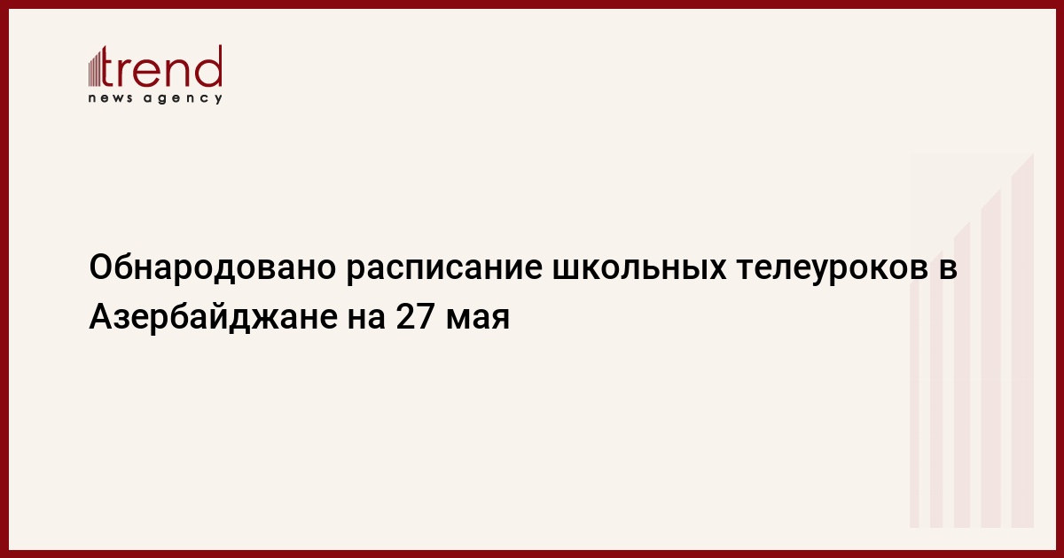 БАКУ /Trend/ - Обнародовано расписание школьных занятий на 27 мая в рамках передачи "Время урока", транслируемой при поддержке министерства образования на телеканалах Mədəniyyət (Культура) и ARB Günəş, сообщает во вторник Trend со ссылкой на министерство.