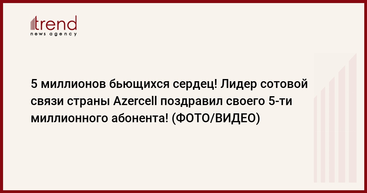 5-ти миллионным абонентом компании, стал житель Сабирабадского района, Эливин Мирзаев. Лидирующий оператор мобильной связи Azercell встретил пяти миллионного «члена семьи» ценными подарками, и будучи эксклюзивным телеком партнером компании Apple в стране, вручил ему новый iPhone SE, а также бесплатную годовую подписку на тариф “Sərbəst75”.