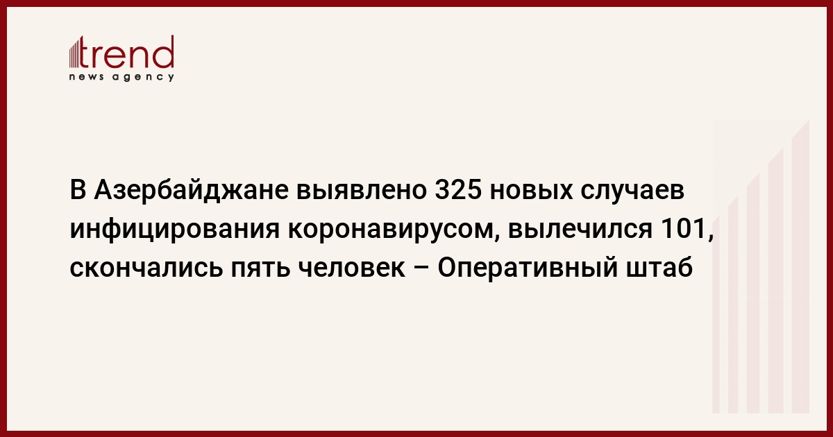 БАКУ /Trend/ - В Азербайджане выявлено 325 новых случаев инфицирования коронавирусом, вылечился 101, скончались пять человек, передает в среду Trend со ссылкой на Оперативный штаб при кабинете министров.