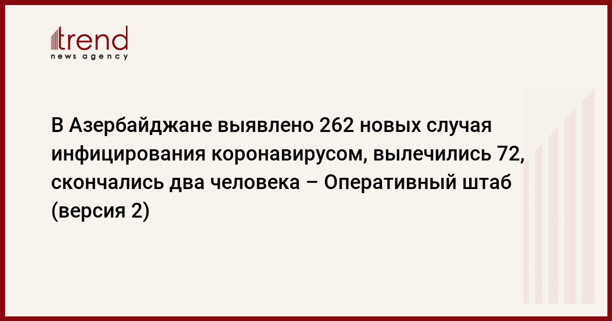 БАКУ/Trend/ - В Азербайджане выявлено 262 новых случая инфицирования коронавирусом, вылечились 72, скончались два человека, передает в четверг Trend со ссылкой на Оперативный штаб при Кабинете министров.