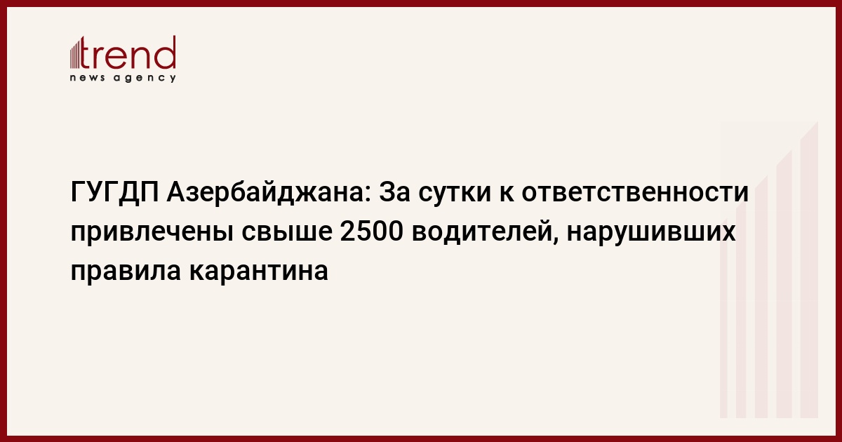 БАКУ/Trend/ - За нарушение особого карантинного режима, примененного на территории Баку, Сумгайыта, Гянджи, Лянкярана и Абшеронского района в целях предотвращения распространения коронавирусной инфекции (COVID-19), с 00:00 часов 6 июня до 06:00 часов 8 июня к ответственности были привлечены 2 524 человека, передвигавшихся на транспортных средствах, сообщает в понедельник Trend со ссылкой на Главное управление государственной дорожной полиции (ГУГДП).