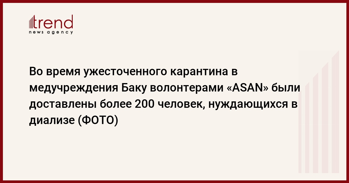БАКУ /Trend/ - Во время двухдневного ужесточенного карантина посредством "горячей линии" "108" Службы "ASAN" была обеспечена перевозка более 200 пациентов, нуждающихся в диализе, в соответствующие медучреждения, сообщает во вторник Trend со ссылкой на Службу «ASAN».
