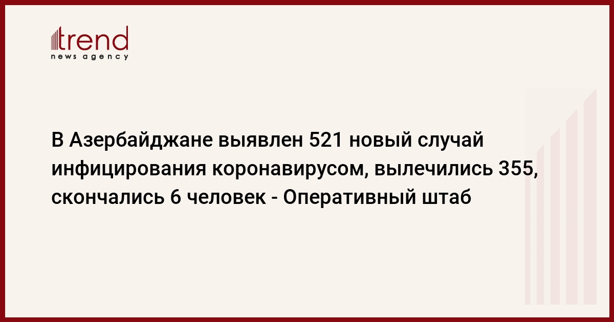 БАКУ/Trend/ - В Азербайджане выявлен 521 новый случай инфицирования коронавирусом, вылечились 355, скончались 6 человек, сообщает в субботу Trend со ссылкой на Оперативный штаб при Кабмине.