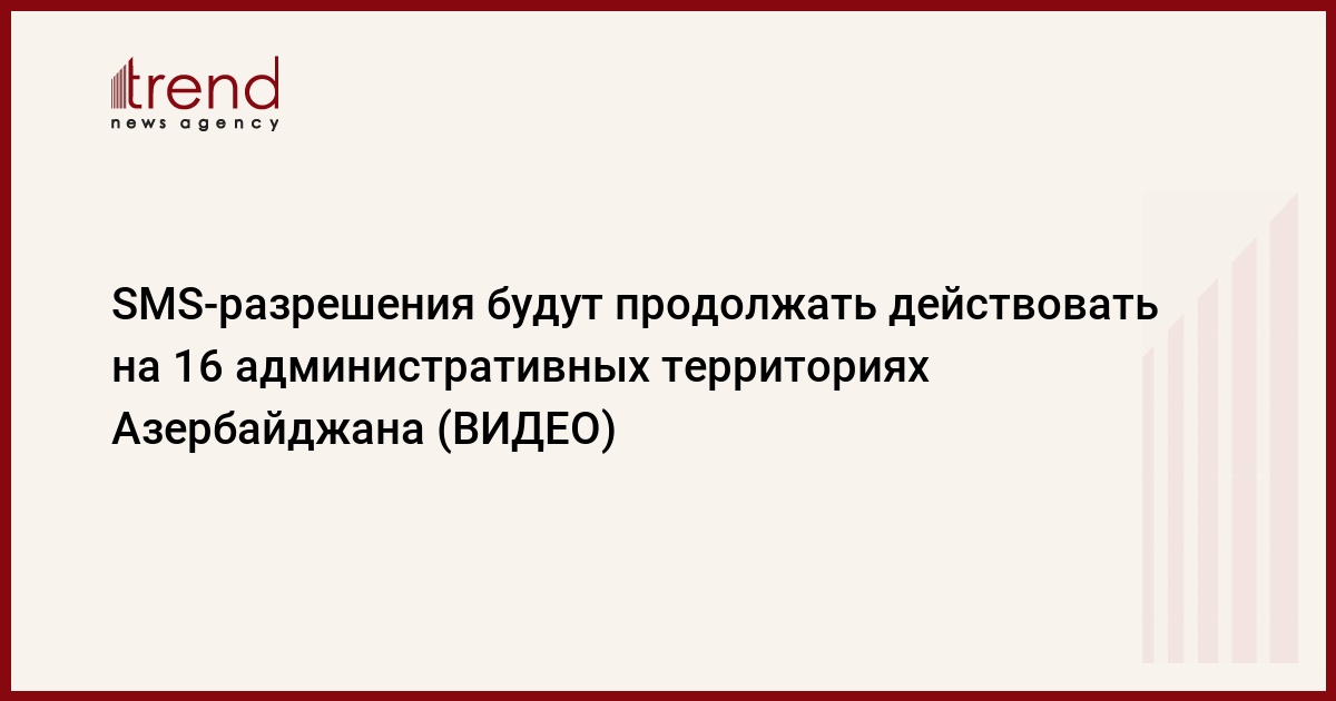 БАКУ /Trend/ - Система SMS-разрешений 8103, совместно разработанная Центром развития электронного правительства при Государственном агентстве по обслуживанию граждан и социальным инновациям при Президенте Азербайджанской Республики и министерством внутренних дел, будет продолжать действовать с 06:00 5 июля 2020 года по 06:00 20 июля 2020 года в Баку, Сумгайыте, Гяндже, Лянкяране, Евлахе, Масаллы, Джалилабаде и Абшероне, в том числе в городах Мингячевир, Геранбой и Гёйгёль, Бардинском, Сиязанском, Шекинском и Хачмазском районах.