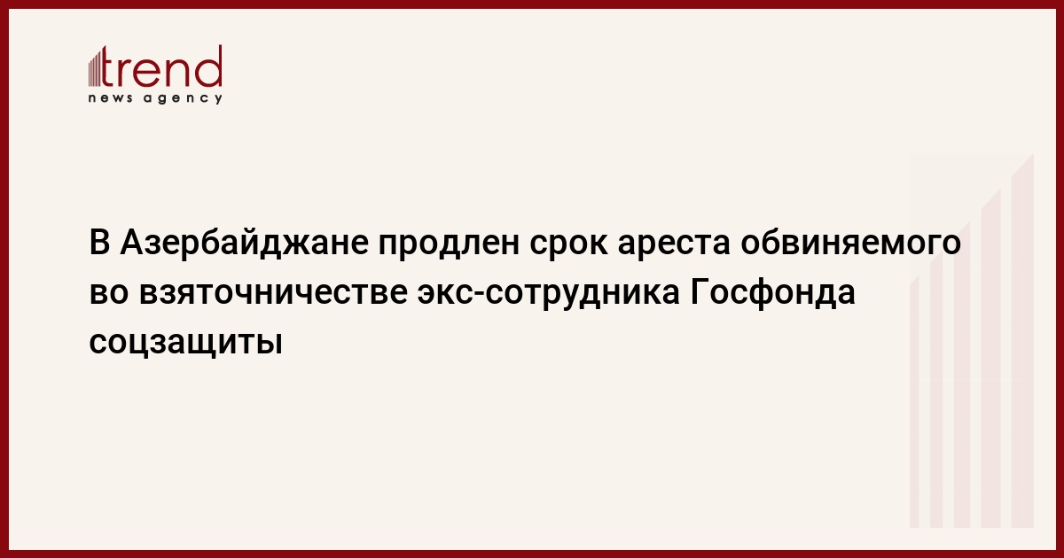 БАКУ /Trend/ - В Бинагадинском районном суде рассмотрено представление следственного органа в связи с продлением срока меры пресечения в виде ареста в отношении бывшего главного бухгалтера Джалилабадского районного отдела Государственного фонда социальной защиты Парвиза Искендерова, арестованного за взяточничество, сообщает во вторник Trend.