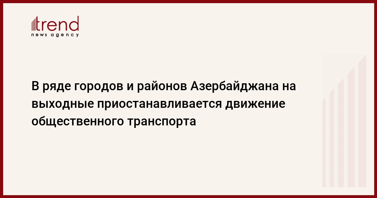 БАКУ /Trend/ - Для предотвращения распространения коронавирусной инфекции с 00:00 часов 17 октября до 06:00 часов 19 октября, с 00:00 часов 24 октября до 06:00 часов 26 октября и с 00:00 часов 21 октября до 06:00 часов 2 ноября будет прекращено движение общественного транспорта в гг. Гянджа, Евлах, Мингячевир, Лянкяран, Шеки, Ширван и Гёкгёльский, Самухский, Сабирабадский и Губинский районы.