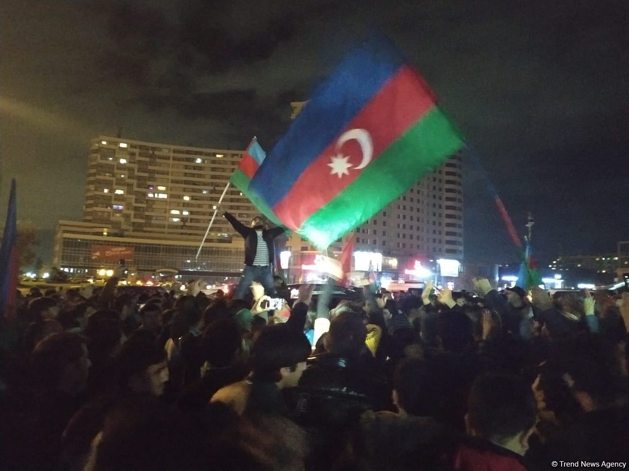 Как передает Trend, сразу после заявления Президента Ильхама Алиева о победе и подписании документа о капитуляции Армении, жители столицы вышли на улицы с флагами и аплодируют этой радостной новости.