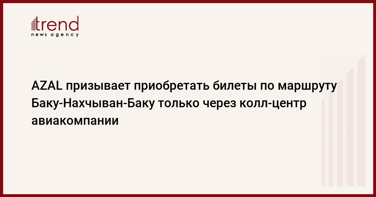 БАКУ /Trend/ - После объявления о возобновлении внутренних рейсов по маршруту Баку-Нахчыван-Баку в социальных сетях появились различные сообщения о продаже авиабилетов в этом направлении. Национальный авиаперевозчик Азербайджана (AZAL) призывает пассажиров приобретать билеты по данному маршруту только через колл-центр авиакомпании, в противном случае они могут стать жертвами мошенников.