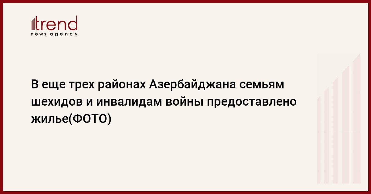 БАКУ /Trend/ - Под руководством Президента, Верховного Главнокомандующего Ильхама Алиева отважная азербайджанская армия написала славную историю побед и освободила наши территории от армянской оккупации. В дни, когда мы живем радостью победы, принимаются меры по обеспечению семей шехидов и инвалидов войны жильем и частными домами. Сегодня министерство труда и социальной защиты населения Азербайджана предоставило лицам из этой категории 19 квартир и частных домов еще в 3-х районах (10 квартир в Лянкяране, 9 частных домов в Сабирабаде и Сальяне).