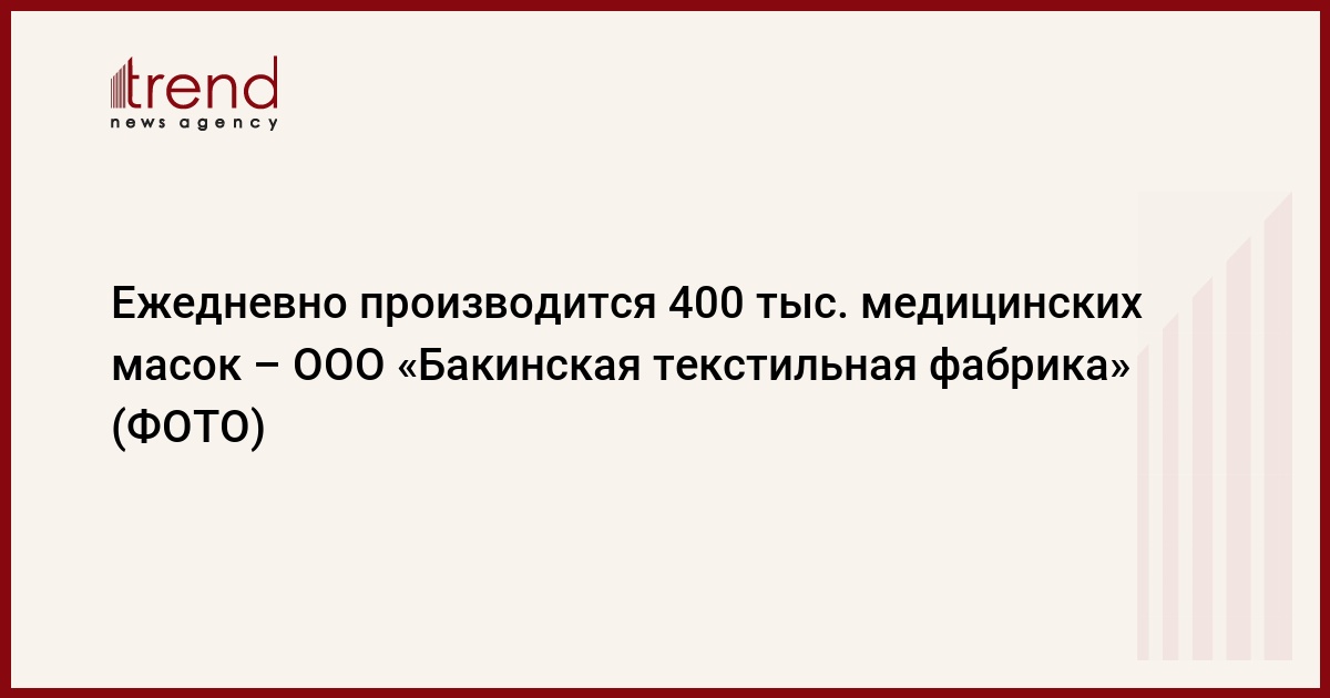 «На предприятии ежедневно производится 400 тысяч масок. В настоящее время в запасе 1 млн масок и сырьевые ресурсы для производства 8 млн защитных средств. Производственный процесс идет в полную мощность и удовлетворяет потребность даже в объеме 700-800 тысяч масок в день. Кроме того, на предприятии производятся медицинские головные уборы, комбинезоны и одноразовые хирургические фартуки, которые также необходимы»,- сказала глава Объединения.