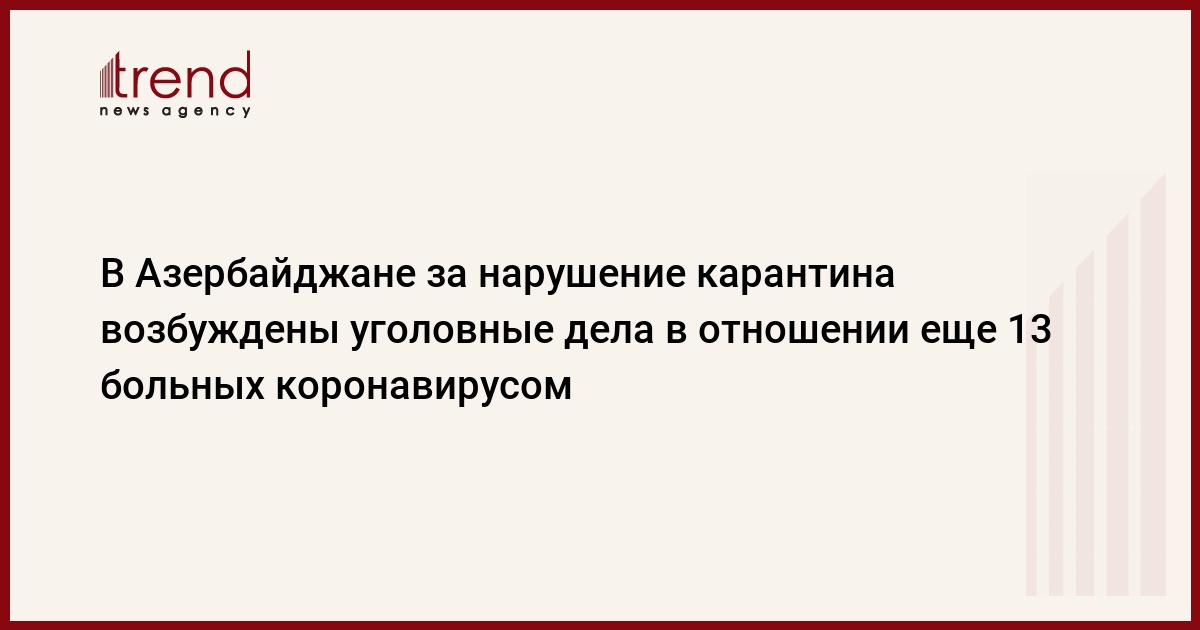 В отношении 13 человек, которые создали реальную угрозу для распространения коронавирусной инфекции нового типа, нарушая противоэпидемический, а также карантинный режимы, были возбуждены уголовные дела по статье 139-1.1 (нарушение противоэпидемического, санитарно-гигиенического или карантинного режимов) УК Азербайджана. В настоящее время следственные мероприятия по этим делам продолжаются.