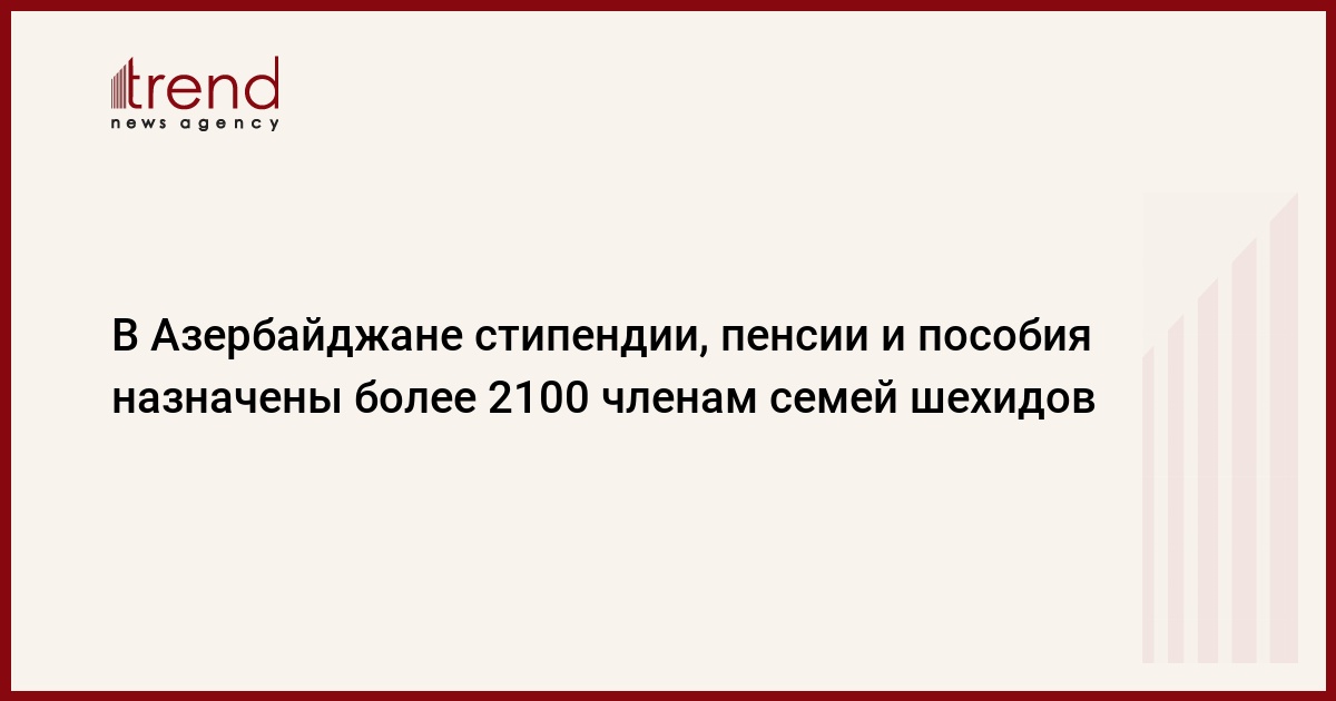 Одной из этих социальных выплат является ежемесячная президентская стипендия. Как очередное наглядное проявление особой заботы Президента Ильхама Алиева о семьях шехидов, с 1 января размер этой пенсии увеличен на 66,7% - с 300 до 500 манатов. Наряду с этой пенсией семьи шехидов ежемесячно обеспечены другими пособиями или пенсией.