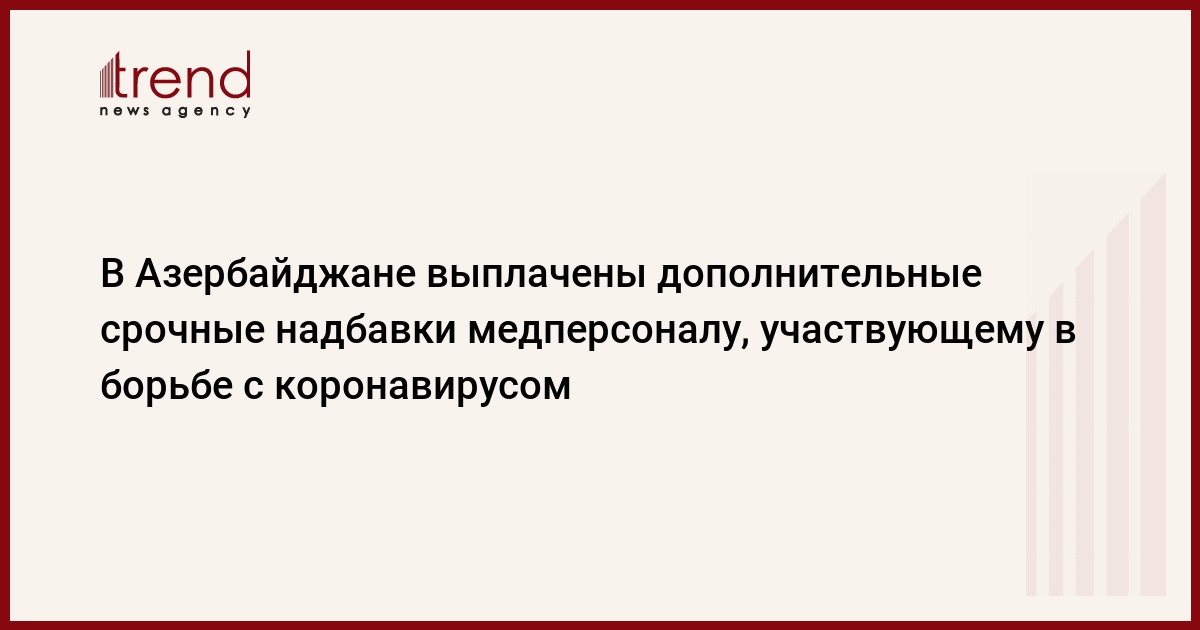 Срочные надбавки на общую сумму 20 миллионов манатов выплачены 13 641 медработнику и 3 114 работникам из числа немедицинского персонала 33 государственных медучреждений по Баку и 78 государственных медучреждений в других городах и районах республики.