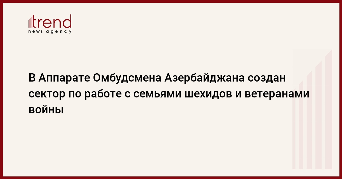 БАКУ /Trend/ - В Аппарате Уполномоченного по правам человека (Омбудсмена) Азербайджана создан сектор по работе с семьями шехидов и ветеранами войны.