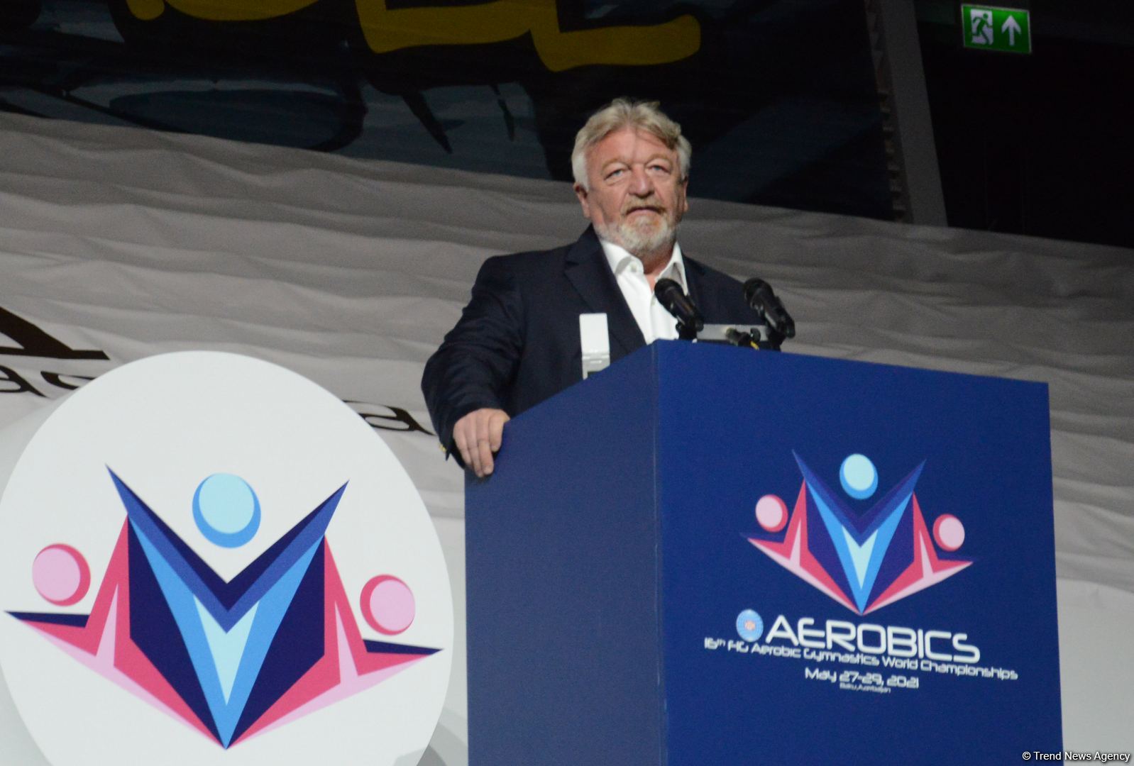 «Дамы и господа, дорогие друзья, от имени Международной федерации гимнастики хочу сказать, что мы очень рады и горды объявить об открытии 16-го чемпионата мира по аэробной гимнастике, который сегодня стартовал в Баку. Счастлив приветствовать участников со всего мира, их тренеров и судей, а также поклонников этого замечательного вида спорта.