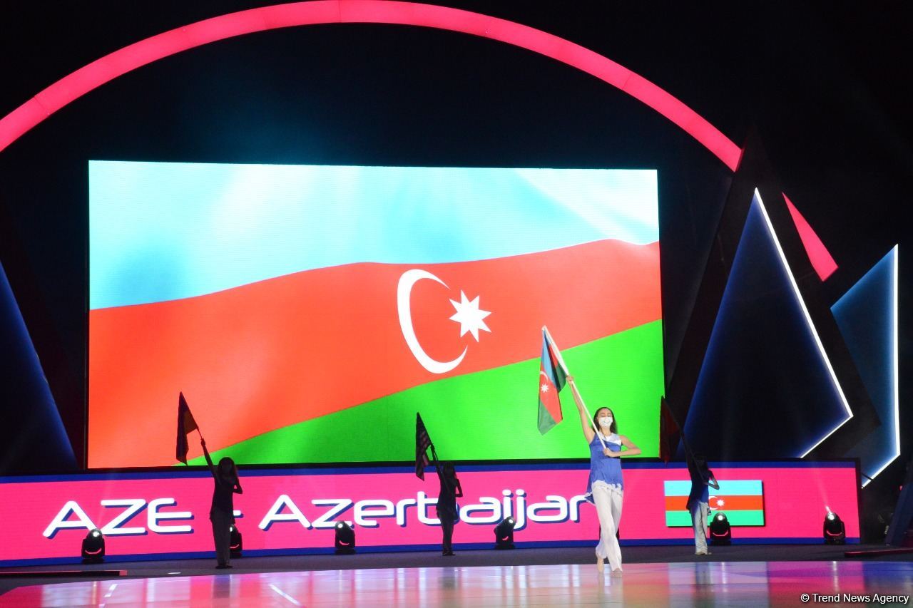 На мероприятии была представлена гимнастическая композиция. Прошел парад флагов стран-участниц чемпионата мира по аэробной гимнастике в Баку.