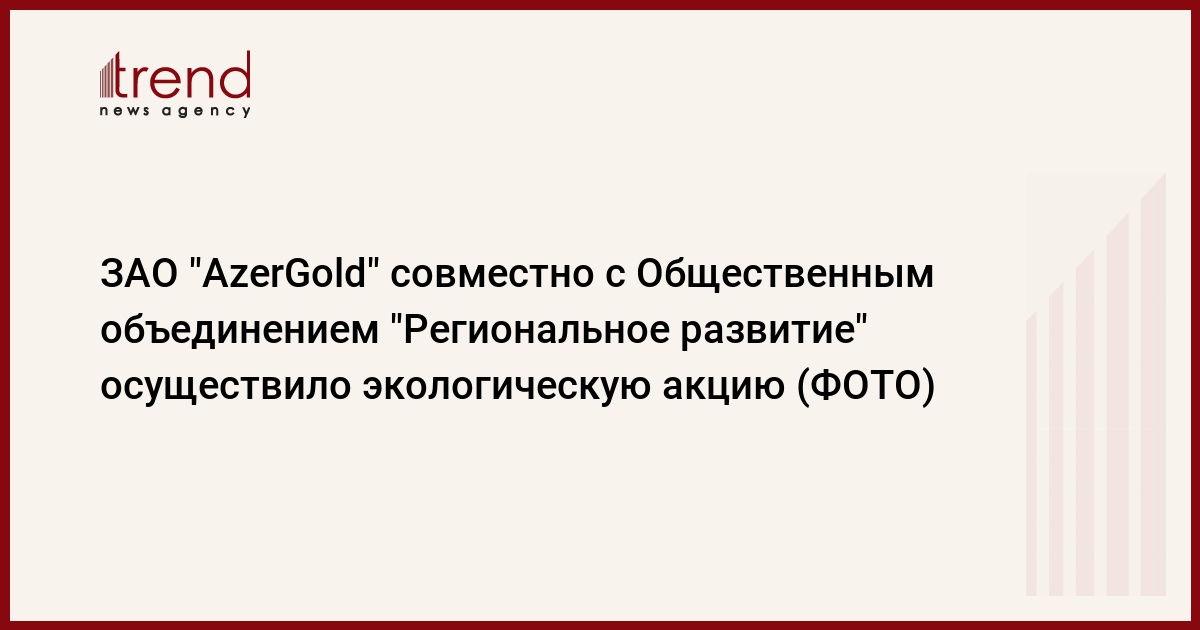 БАКУ /Trend/ - Закрытое акционерное общество (ЗАО) "AzerGold" совместно с Общественным Объединением “Региональное развитие” осуществили экологическую акцию под лозунгом «Уважение к природе – забота о будущем», приуроченную к 5 июня – Всемирному дню охраны окружающей среды, сообщает Trend со ссылкой на ЗАО.
