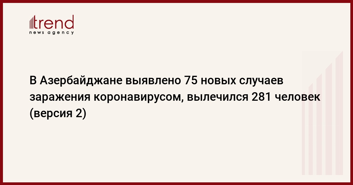 БАКУ /Trend/ - В Азербайджане за последние сутки выявлено 75 новых случаев заражения коронавирусом, вылечился 281 заболевший, трое человек скончались, сообщает в четверг Trend со ссылкой на Оперативный штаб при Кабинете министров.